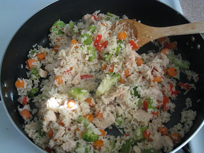 6.Then stir in the rice. The 'fried' part is now, when you let it cook on med. low and don't stir for 5 minutes or so the rice and veggies get all crispy and fried looking. Then flip over each chunk, and let it fry on the other side. *(like hashbrowns...)